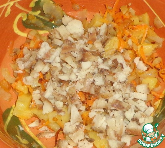 Отварное рыбное филе или запеченное в духовке порезать кубиками и добавить к овощам.