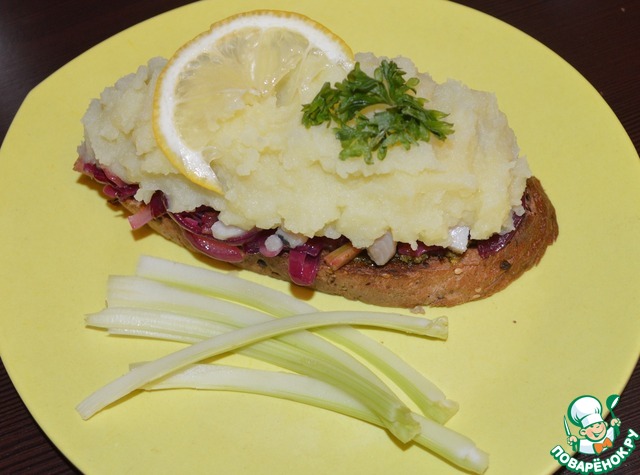 Делаем густое пюре - так чтобы стояла ложка. Ничего добавлять не нужно, только отвар и сам картофель, соль тоже не нужно добавлять. Выкладываем слоями: тост, песто (горчица), лук с сельдереем, сельдь, картофель, украшение