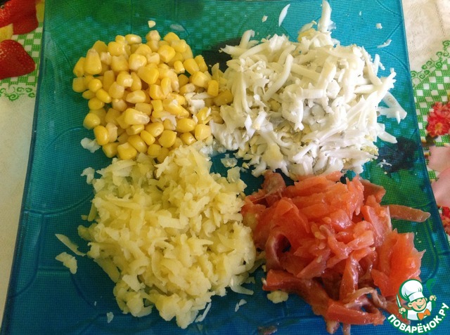Яйцо и картофель трем на терке, с кукурузы сливаем лишнюю жидкость, семгу режем тонкими полосками, или если вам нравится мелкими кубиками