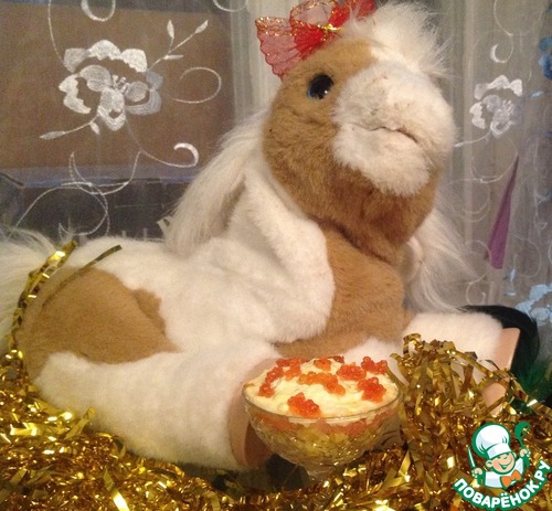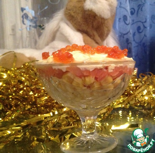 Сначала идет картофель, затем кукуруза, далее рыба, яйцо и майонез. Сверху украшаем икрой.