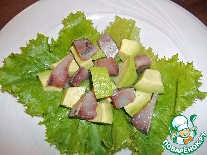 На тарелку выложить лист салата. На него - произвольно кусочки авокадо и сельди.