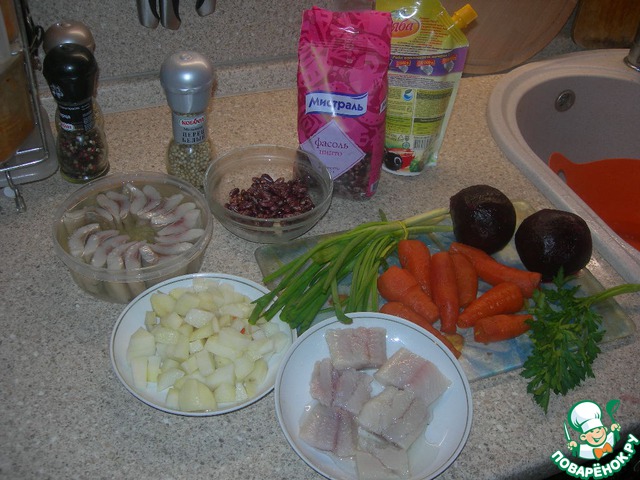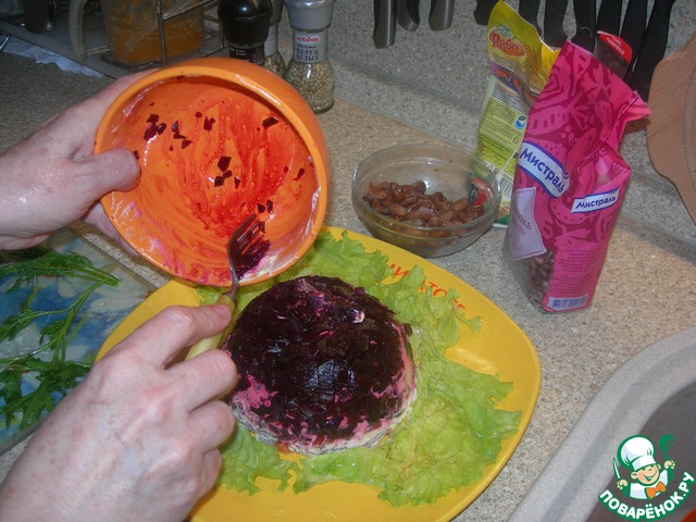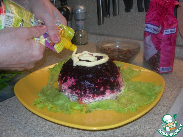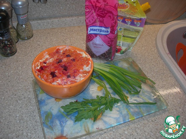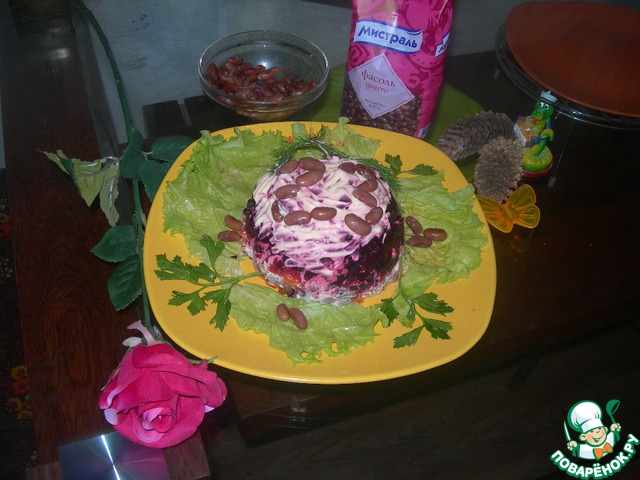 Послойно выкладываем их в форму: снизу первой идет свекла, за ней морковь, ФАСОЛЬ, картофель. ВСЕ слои промазываем немного майонезом. Укладываем бережно нашe филе.