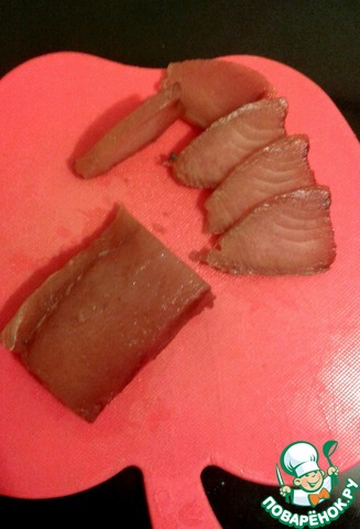 Нарезаем тунец ломтиками толщиной около 4 мм