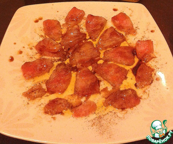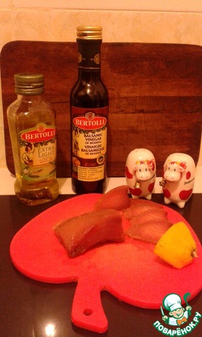 На более-менее плоское блюдо выкладываем кусочки тунца. Это у меня, как обычно маленькая порция, если ломтиков больше, то можно выложить плотнее друг к другу и до краёв тарелки. Посыпаем филе мелкой солью средне, не обильно, потом молотым перцем и сбрызгиваем 2 ст ложками лимонного сока и 2 ст ложки бальзамика. Я обычно это делаю так: ладошку делаю лодочкой (как люди мылостыню просят), наливаю в ладошку сок и бальзамик и растопыривая пальчики, капаю соком на поверхность филе, стараюсь делать это равномерно. Так же с бальзамиком и потом тонкой струйкой оливкового масла как бы рисую сеточку))) сверху еще раз посыпаю солью слегка.