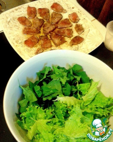 На утро (или через 4 часа) филе промаринуется и будет выглядеть так. Достаем из холодильника, снимаем пленку, пробуем кусочек, если чего-то не хватает - добавляем. Обычно сразу очень вкусно. Рвем салат и рукколу, стебли не используем, только листья, раскладываем на тарелке вперемешку поверх филе. Режем помидорки черри вдоль, выкладываем на листья хаотично, сбрызгиваем оливковым маслом и бальзамиком слегка (или соком лимона), солим тоже слегка, твердый сыр типа пармезана ножом к себе режем тоненькими хлопьями, можно просто посыпать пармезаном слегка. Я иногда добавляю кедровые орешки если есть.