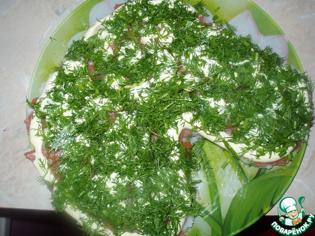 Выложить салат по слоям, формирую лошадку: первый - плотно утрамбованный рис, вторым слоем - сёмгу, смазать майонезом, далее - посыпать рубленным укропом.