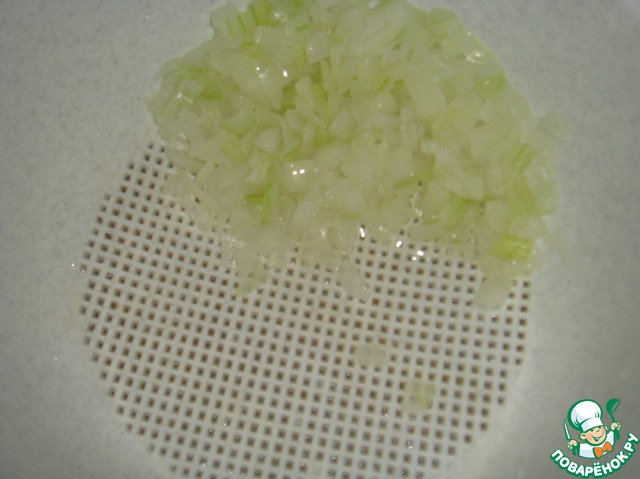 Лук мелко порезать. Ошпарить кипятком и обдать холодной водой (лук будет не горький и хрустящий).