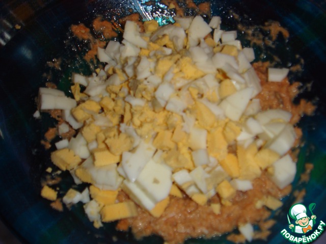 Сваренные вкрутую яйца мелко нарезать, добавить к рыбе.