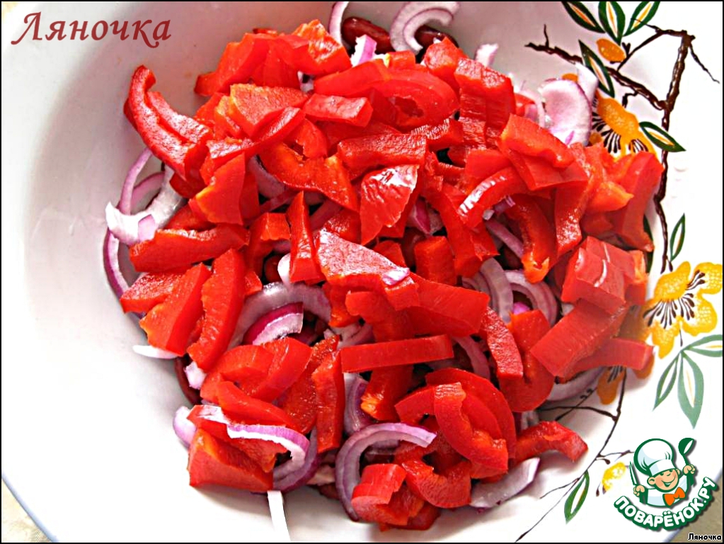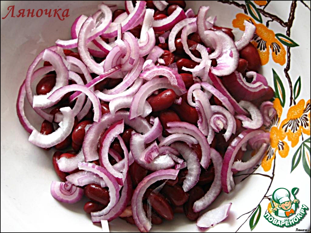 Луковицу нарезать полукольцами, сбрызнуть винным уксусом и добавить к фасоли.