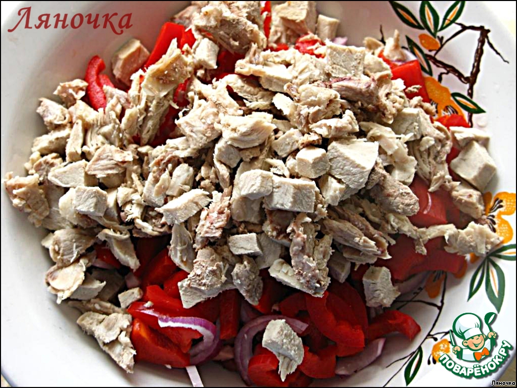 У болгарского перца и у чили убрать семена и нарезать тонкой соломкой, добавить в салат. Я не использовала чили.