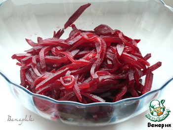 Запеченную (или отварную) свеклу нарезать соломкой. Положить в миску и сразу полить свеклу уксусом и заправить горчицей, свекла медленно впитывает вкусы.