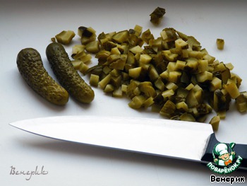 Огурцы режем кубиками и тоже отправляем в чашку.