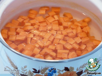 Морковь очистить, нарезать маленькими кубиками, поместить в маленькую кастрюлю, залить стаканом воды и добавить щепоть соли и щепоть сахара (морковь будет сохранять свой вкус). Варить минут 10, до мягкости.