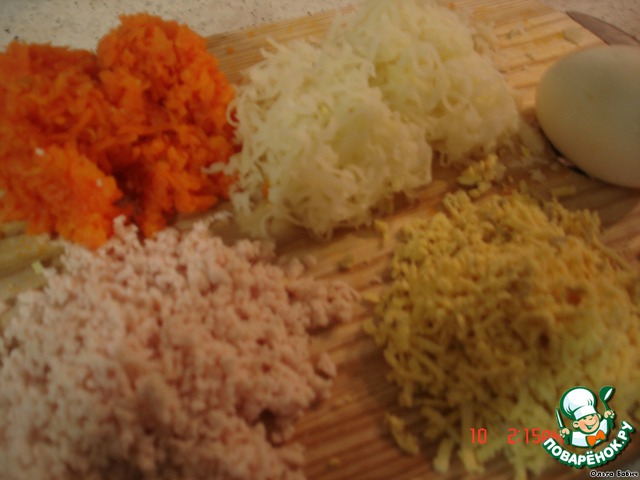 Трем картофель на терке, яйца (отделяя желтки от белков), морковь, пастурму (у меня домашняя, делала по рецепту Лейлы)