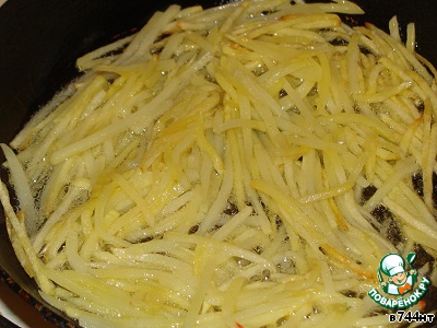 Изначально в рецепте картошка была отварная, но так как мне уж очень приспичило ВСЕ нарезать тонкой соломкой, а отварная картошка ну никак не поддается такой нарезке, я взяла сырую картошку, натерла на терке для корейской моркови, промыла от крахмала и промокнула от влаги салфеткой. Обжарила до состояния готовности, но сильно не зажаривала - чтобы снаружи была зажаренной, а внутри мягкой.