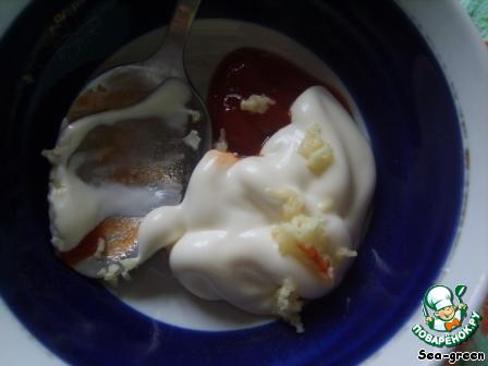 Приготовим заправку: для этого в небольшой мисочке смешать кетчуп, майонез и измельченный чеснок.