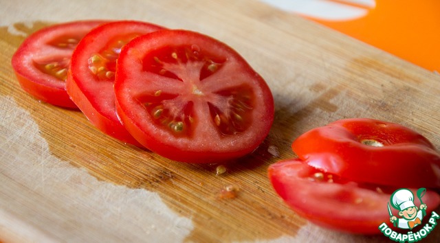 Помидоры нарезать кружочками поперёк. Красивые выкладываем на блюдо, крайние обрезки — в стакан блендера. «Попки», конечно же, вырезаем и в отходы.