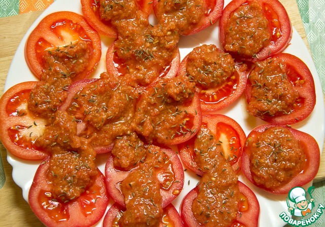 Выложить полученное пюре на помидоры и посыпать тмином.