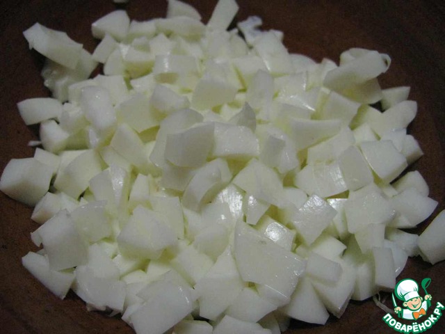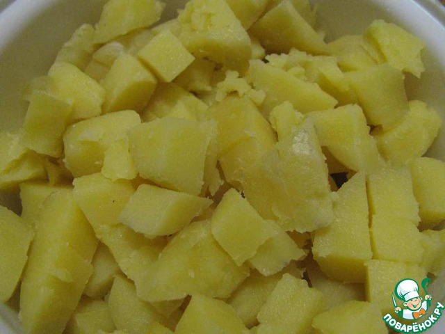 1. Картофель отварить в подсоленной воде до готовности. Слить воду. Остудить картофель и нарезать его кубиками.