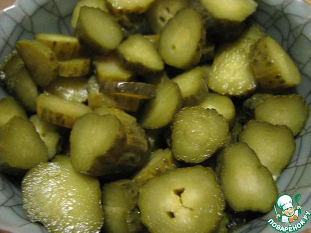 3. Консервированные огурцы нарезать небольшими кусочками (у меня были корнишоны, поэтому я нарезала кружочками).