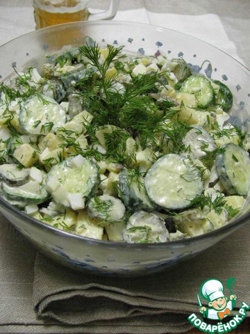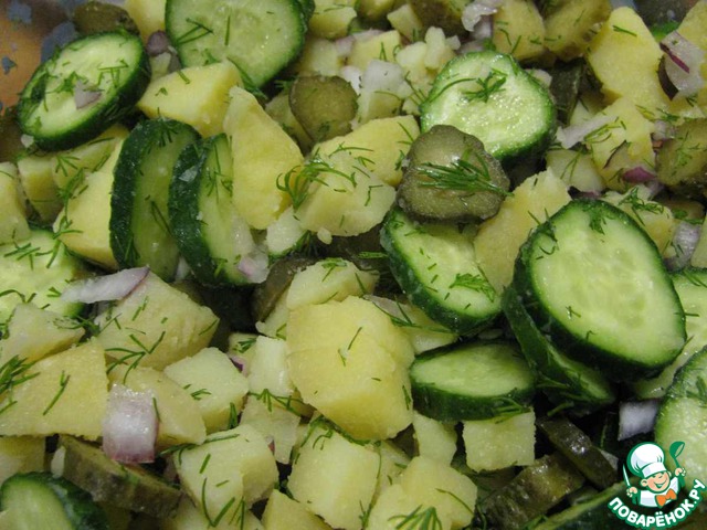 5. Смешать свежий огурец, лук, маринованные огурцы, картофель и половину зелени укропа.