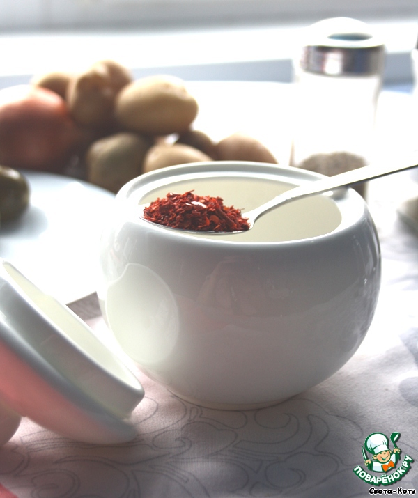 А началось все с заправки. Для приготовления потребуется термостойкая емкость, черный и красный молотые перцы, душистые семена зиры, прованские травы, свежий чеснок и масло.