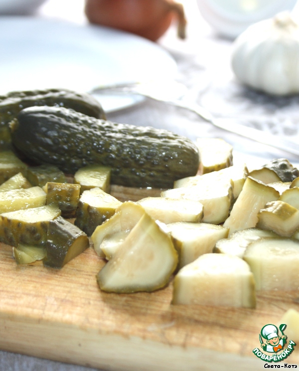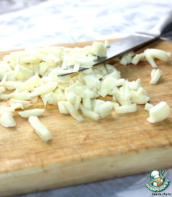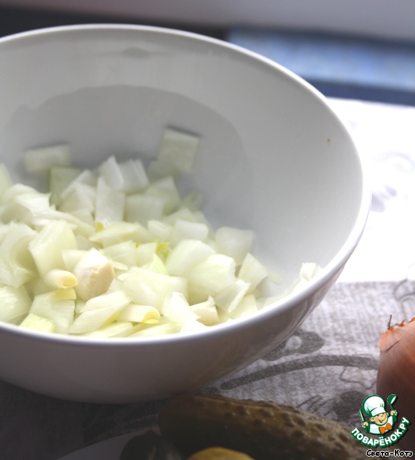 Лук нарезать кубиками, сбрызнуть уксусом и оставить мариноваться.