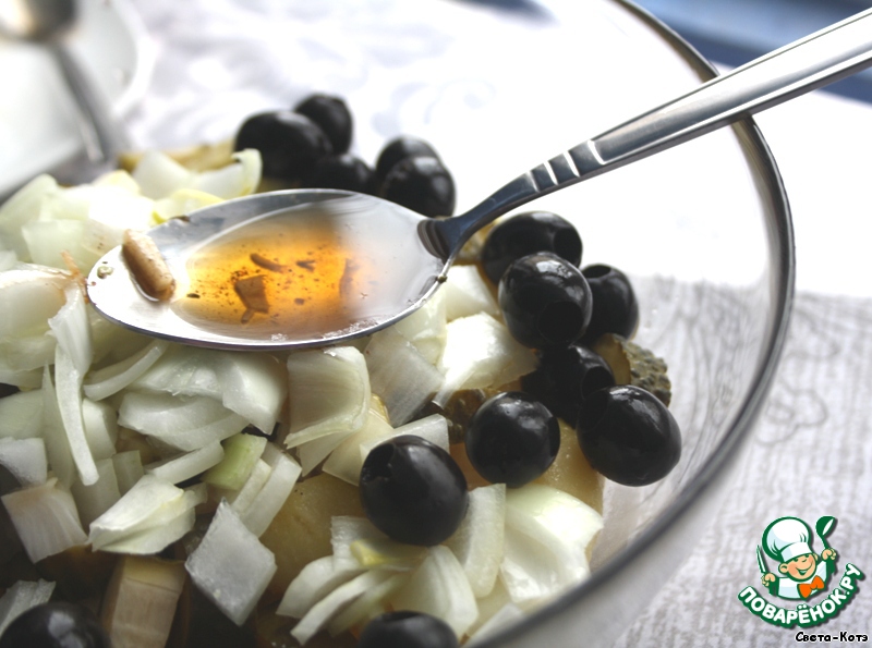 И «прогреть» на сковороде 3-5 минут, с добавлением 2-3-х столовых ложек полученного масла из заправки. Выкладываем теплый картофель в салатницу.