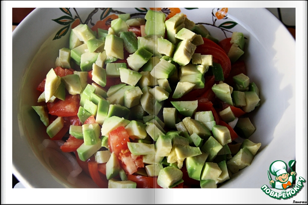 Мякоть авокадо нарезать кубиками. Если вы готовите салат заранее, то авокадо лучше добавить перед подачей.