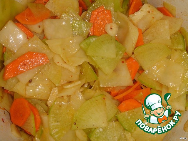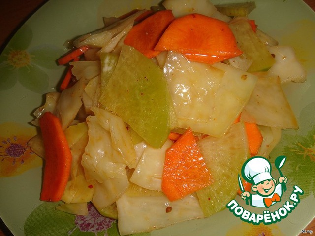 | Этот салат безумно люблю уже много лет, мама всегда делала его много, так как в нашей семье он всегда великолепно воспринимался. Да и в холодильнике хранится долго. А вот муж мой его не любит, говорит, что жевать долго надо:), так что делаю для себя, а потом ем сама и наслаждаюсь... несколько дней подряд:) Для любителей всего корейского, для любителей похрустеть, для тех, кто соблюдает пост. |