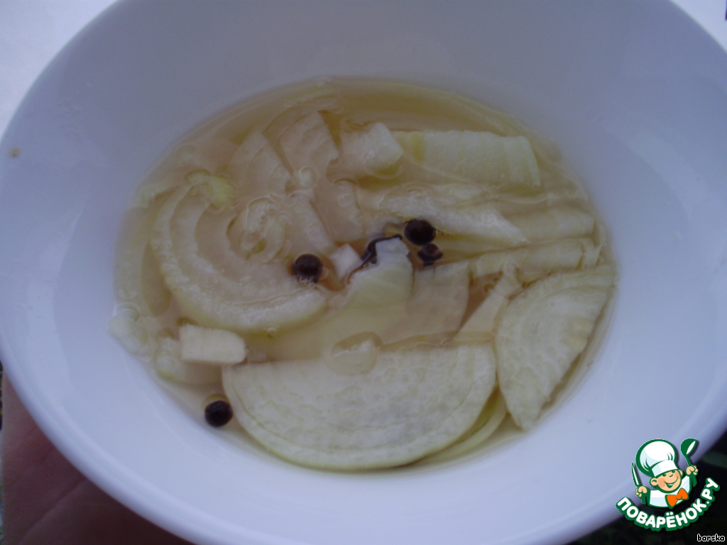 Лук очистить, нарезать полукольцами и замариновать (это и есть - отличие от рецепта-исходника): 2 ст.л. уксуса, душистый перец, лавровый лист, гвоздика + кипяток, чтобы покрыл лук. Оставить на 5-6 минут.