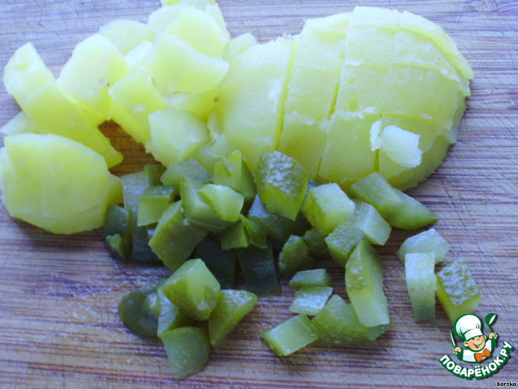 Нарезать кубиками отваренный картофель и солёные огурцы.