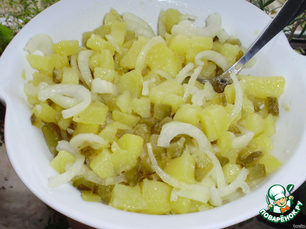 Соединить нарезанный картофель, огурцы, маринованный лук (без жидкости и специй) с заправкой.