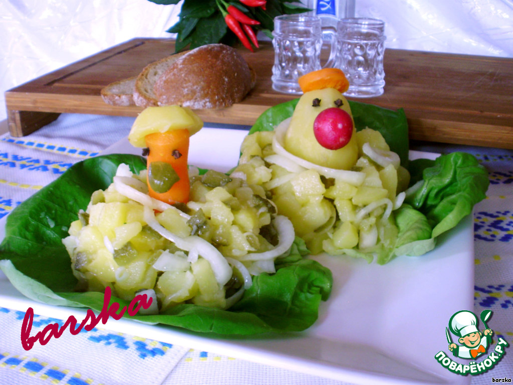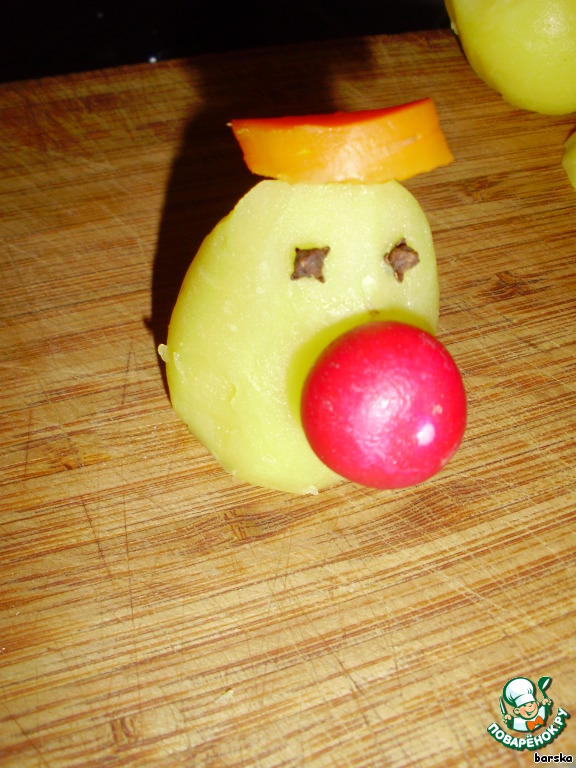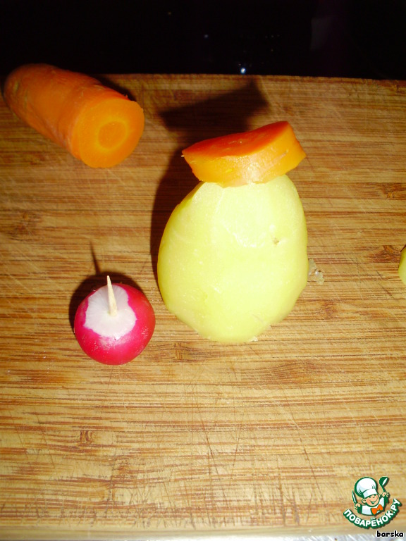 Ну вот так делаются Штепсель и Тарапунька (для декора: 1 отварная картофелина, 1 отварная морковь, 1 редиска, 4 гвоздички для глаз, кусочек солёного огурца + 2 зубочистки, поделенные на кусочки-крепления)