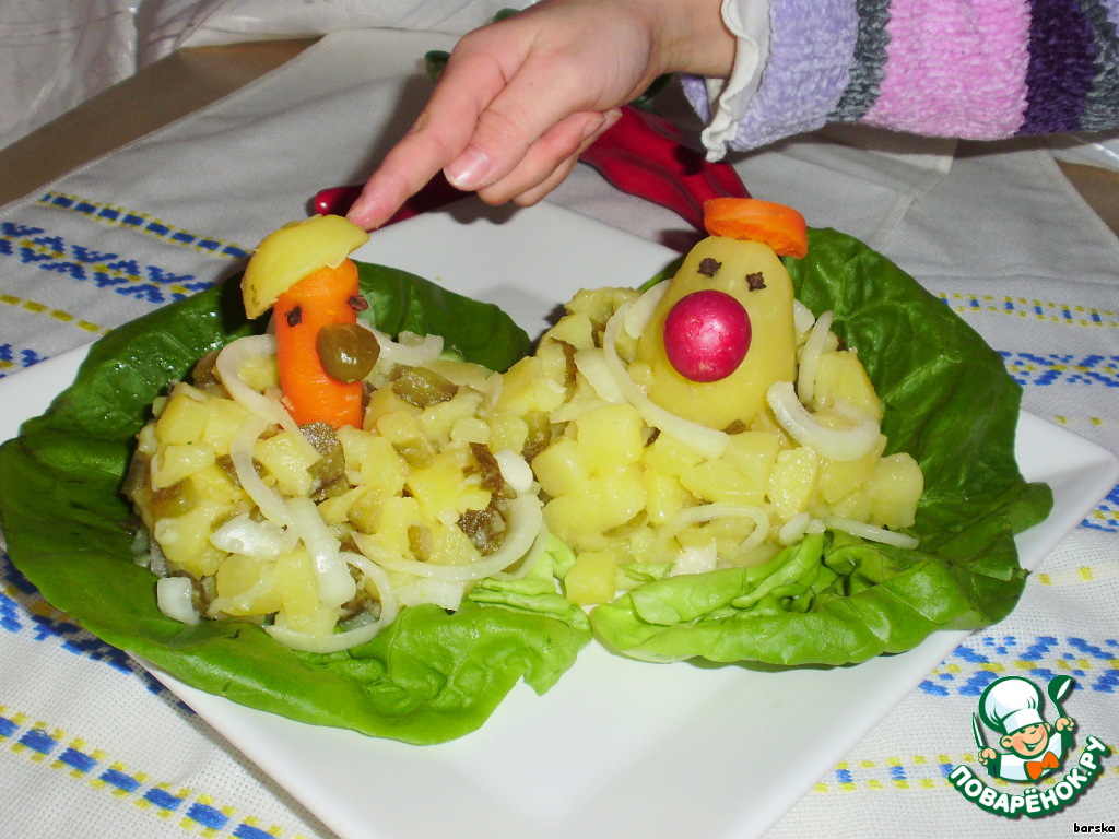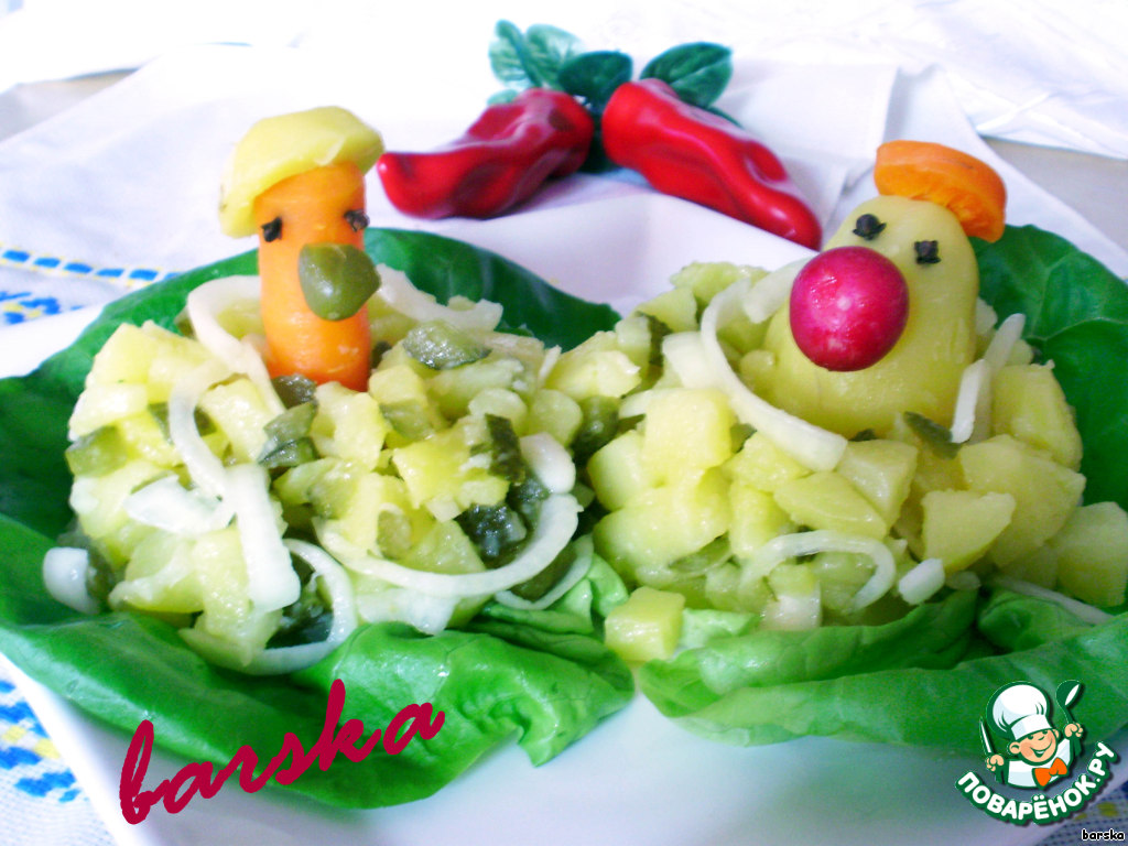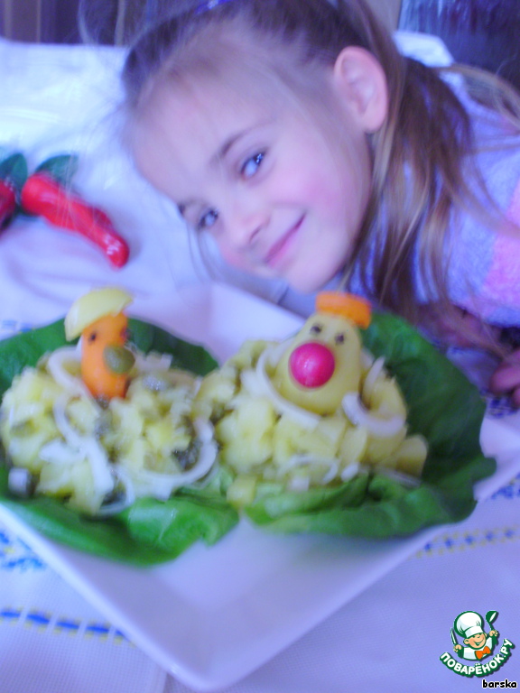 | Анекдот украинский: - Куме, а Вы можЭтЭ выпити вИдро воды? - Я Шо - корова? - А вИдро горИлкЫ? - А я Шо, не козак? ... Вот здесь "зарыт" такой же простой салат, как и этот анекдот. Примечательная ОСОБЕННОСТЬ: ПОСТНЫЙ салат (без спиртного, естественно), ЗИМНИЙ салат, очень просто и тем не менее - очень вкусно, салат для будней и праздников! Рецепт этого блюда был размещeн на сайте в 2008 году пользователем lesi под названием "Салат с картофелем и огурцами" и иллюстрирован мной в рамках акции "Раскраски". |