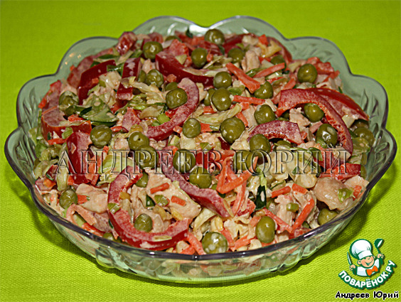 Все компоненты соединить в глубокой чашке, добавить зелёный горошек, соль, перец, заправить майонезом, перемешать и выдержать в холодильнике целых 30 минут!