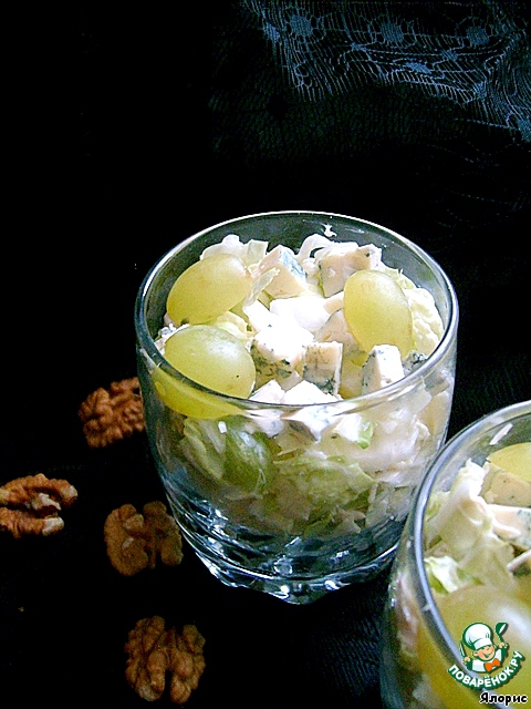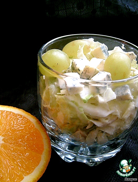 Получился сочный, свежий, оригинальный вкус. Цитрус, орех, капуста, сладость винограда, курица + такая нежная сырная нота и дивный вкус кусочков "Дор-блю". Шикарно! Салат не требует соли, вполне хватило сырной заправки, но это дело вкуса.