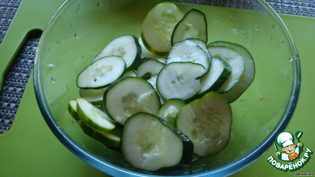 Но можно использовать и не очень кондиционные огурцы. Их резать просто кружочками.