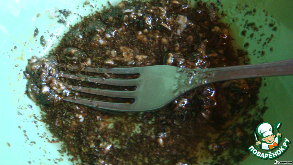 Все составляющие заправки выложить в мисочку и хорошо разболтать вилкой.