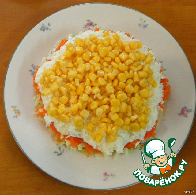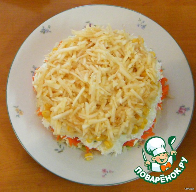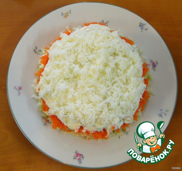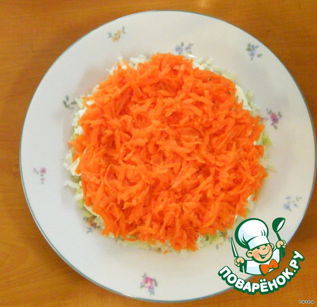 Далее-морковь тертая на крупной терке.Морковь я отваривала до полу готовности(мне кажется так вкуснее)Смазываем заправкой.