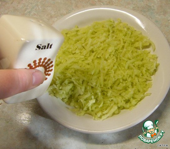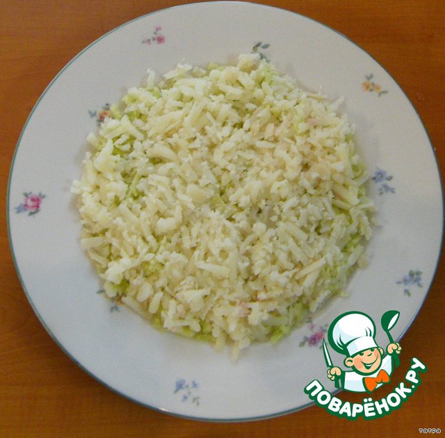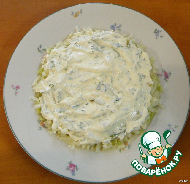 Редьку трем на крупной терке,солим,выделившейся сок сливаем и укладываем первым слоем на блюдо.