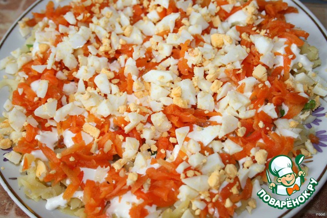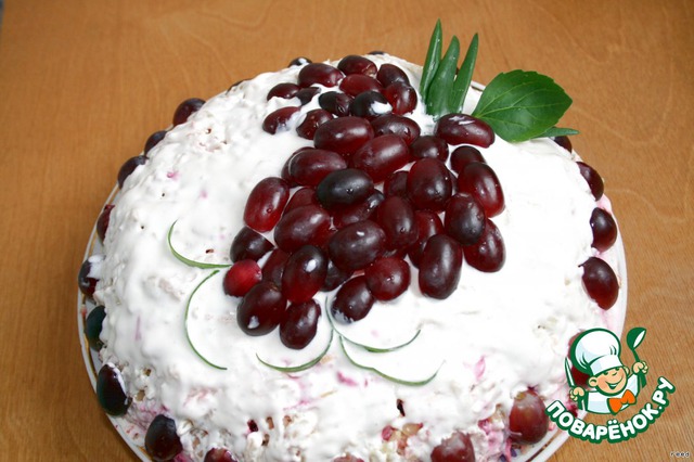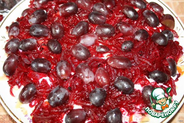 -свекла-виноград (разрезать ягодки пополам).Промазывать каждый слой майонезом смешанным со сметаной и солью.