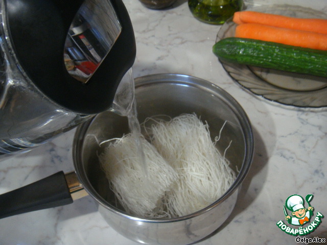 Заливаем фунчозу кипятком и оставляем на 5-7 минут.