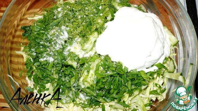 Выложить в салатник капусту, огурцы и зелень, посолить по вкусу.