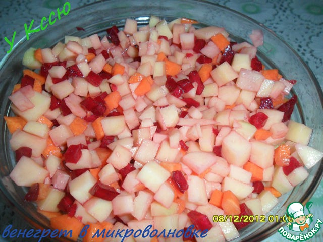 Сырые овощи: морковь, картофель, свеклу режем кубиками, помещаем в миску-кастрюльку (для микроволновки), присаливаем по вкусу, накрываем крышкой или тарелкой и ставим в микроволновку на 10 мин, на самую большую мощность (у меня 900).