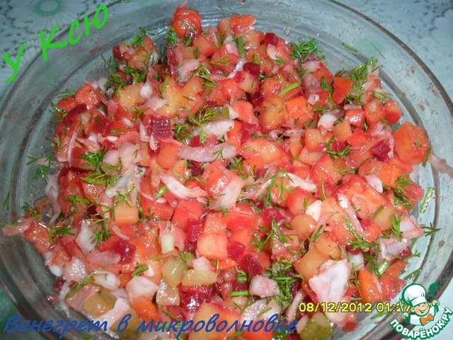 На фото видно время приготовления (без нарезки овощей), так это я дала остыть (на балконе) и добавила уже в остывший винегрет: лук + огурцы + квашеную капусту.