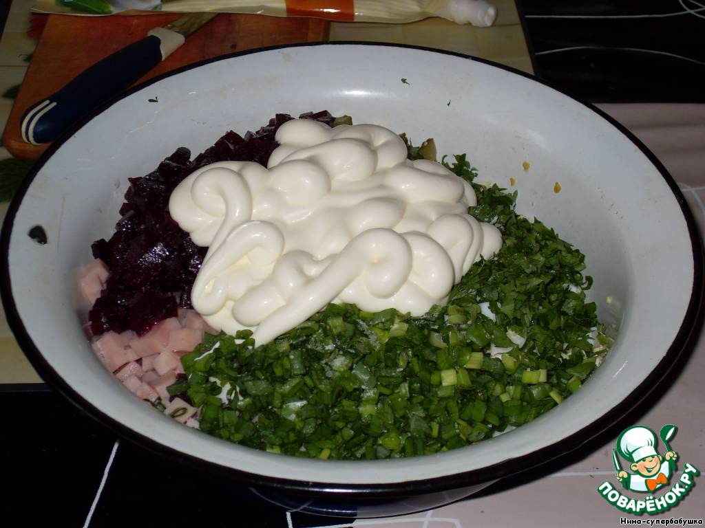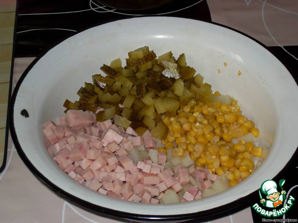 | Один из самых любимых салатов у моих детей. На протяжении многих лет он - непременный компонент нашего новогоднего меню. Да и в течение года нередко его готовлю. Дети назвали его "Мясным винегретом". Правда, обычно я делаю его с отварной говядиной и зеленым горошком. Сегодня впервые решила сделать его с ветчиной и кукурузой (именно такой набор продуктов оказался в холодильнике) - получилось очень вкусно! |