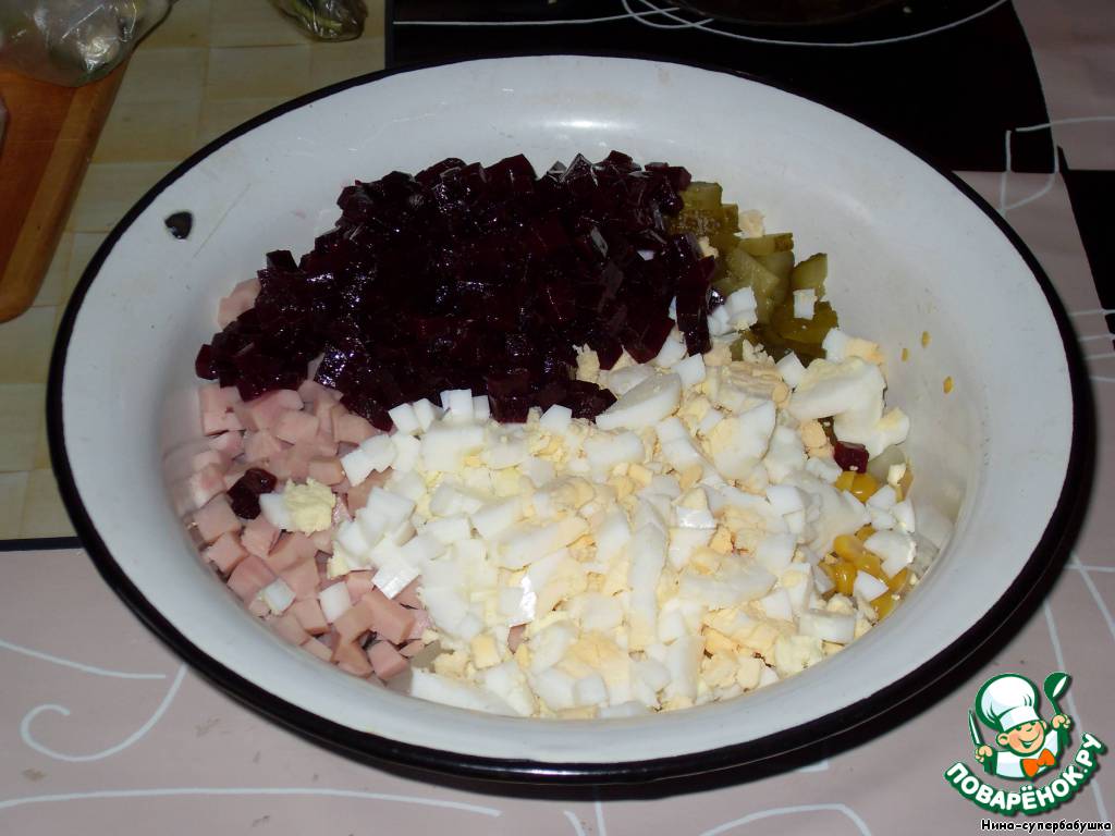 Свеклу очистить, нарезать маленькими кубиками в отдельную чашку, добавить чайную ложку растительного масла и тщательно перемешать. После этого добавить к салату.