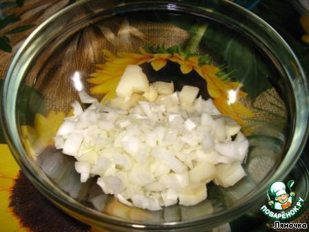 Порезать белый лук, добавить его к картофелю. В принципе, можно использовать и обычный лук, это дело вкуса.