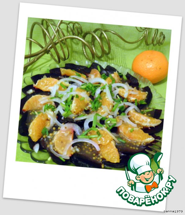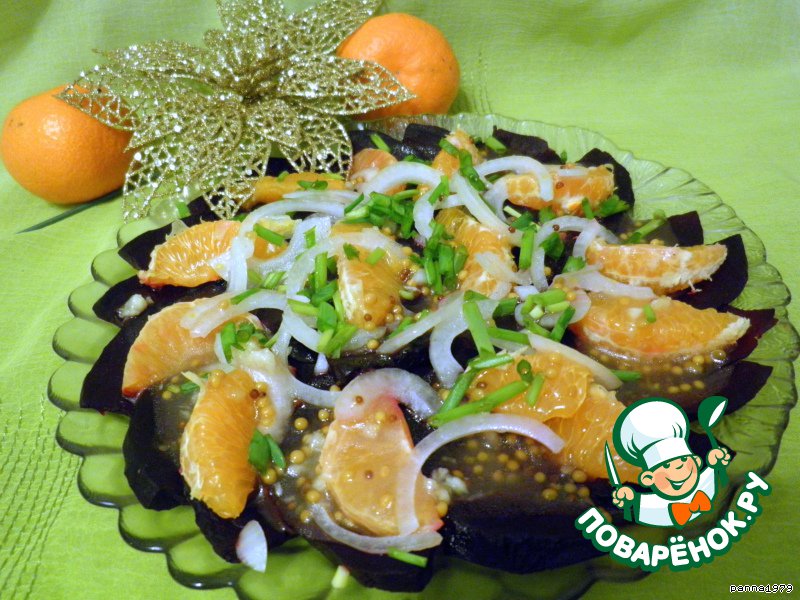 Мандарины очистить от кожуры, поделить на дольки и снять пленку, если есть косточки, избавиться и от них. Тут мне немного не повезло, дольки одного из мандаринов наотрез отказались чиститься, пришлось оставить их какими есть. Выкладываем мандариновые дольки на свеклу.